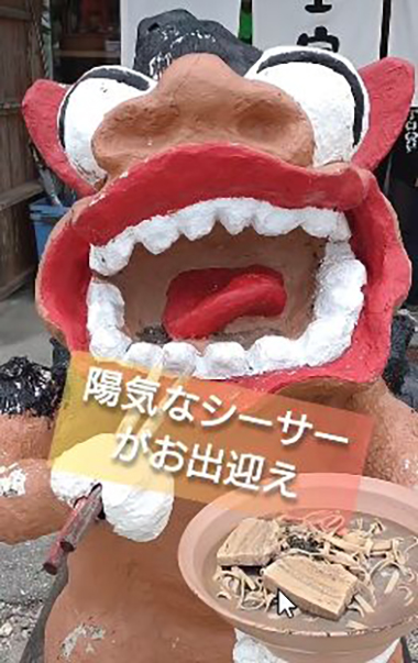 シーサーが沖縄そばを片手にお出迎えしてくれま